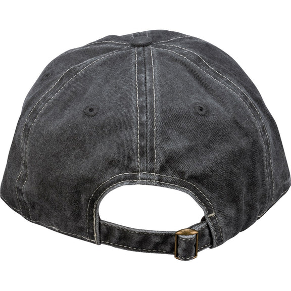 A cotton baseball cap with an adjustable brass closure on the back. Features "Happy Camper" sentiment embroidered in cream onto charcoal base. One size fits most. Hand-wash only.