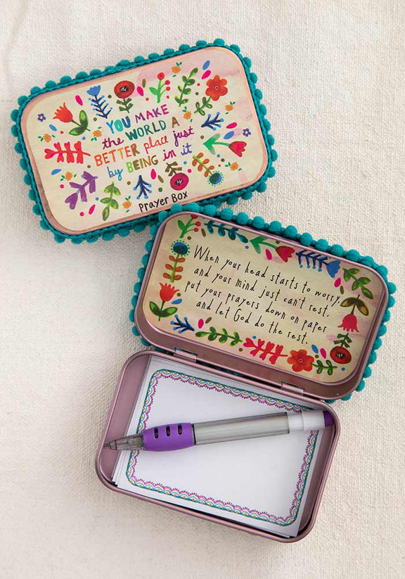 Gold tin box, paper notes, and a mechanical pencil inside. Enough notes for 50 prayers.