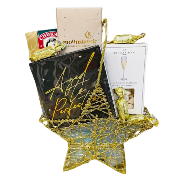 Celebrate the beauty of aging gracefully with the Aged To Perfection Birthday Gift Basket. This thoughtfully curated collection features decadent chocolates, beverage napkins, and delightful treats, all wrapped in a charming star-shaped basket adorned with golden accents. Perfect for honoring a special birthday, this gift basket embodies joy and indulgence, making it a heartfelt way to toast to another fabulous year. Treat someone special to a memorable celebration with a gift that reflects their wonderful journey through life!