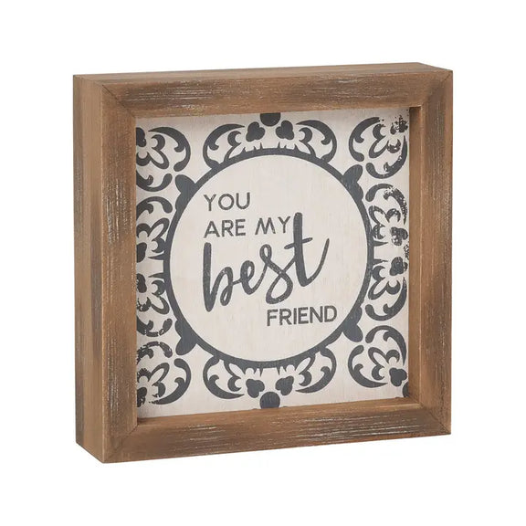 Measurements: 6" w x 6" t x 1 1/2" d. "You are my best friend" Wood framed sign, distressed pattern background, and black text.