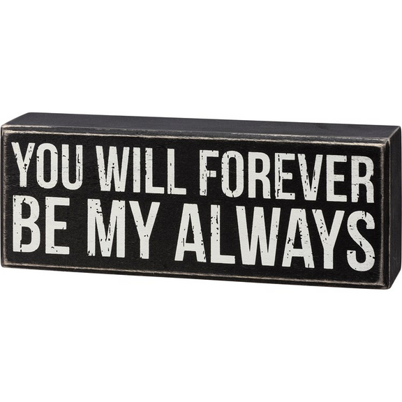 A classic black and white wooden box sign featuring a distressed "You Will Forever Be My Always" sentiment. Our You Will Forever sign is easy to hang or can free-stand alone.