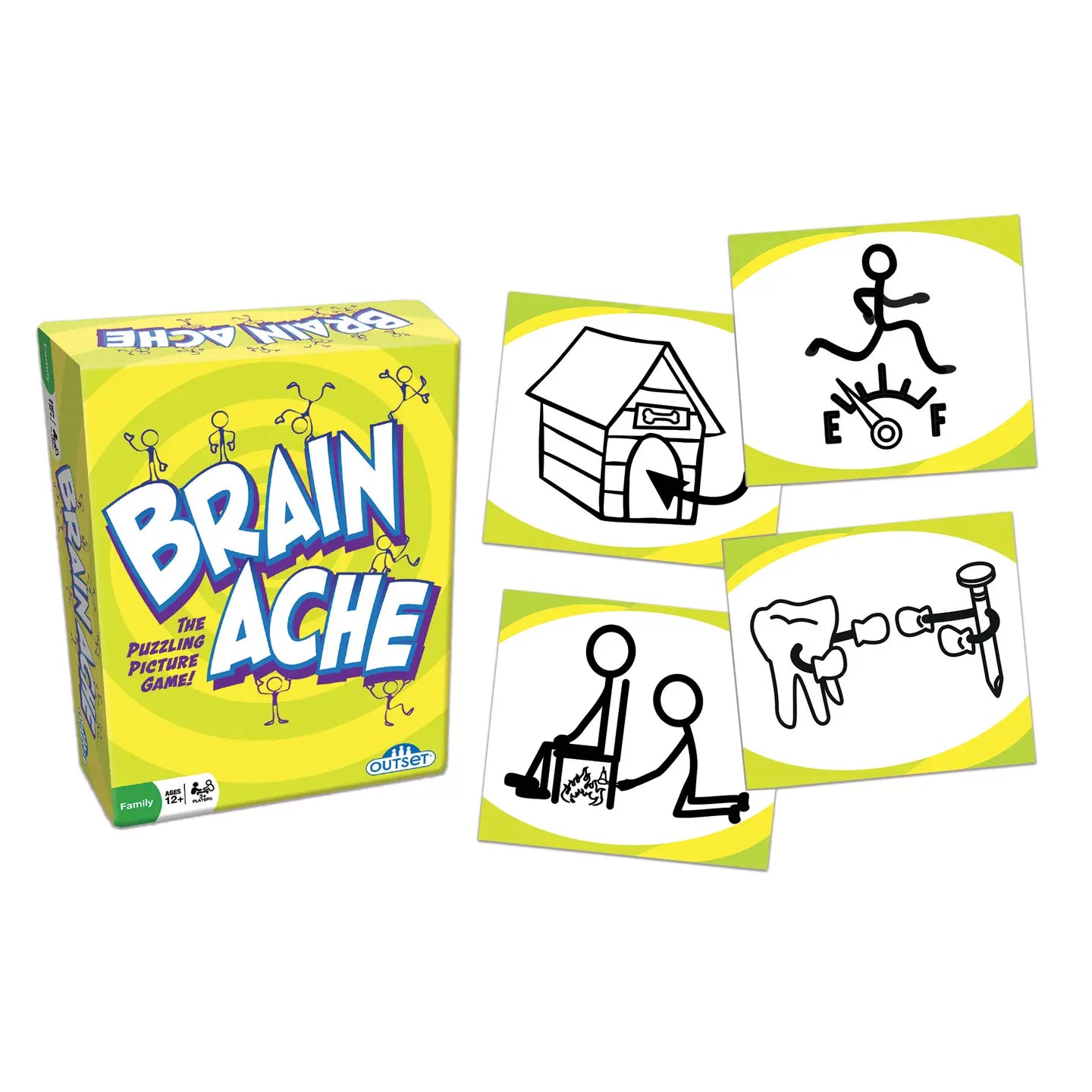 Brain Ache is the ultimate puzzling picture game that will challenge the whole family! In this fast-paced game, players race to identify familiar catchphrases, words, or sayings, all depicted through quirky and sometimes perplexing drawings. The faster you guess, the more cards you win—but be careful, because the images can be tricky! The first player to collect 10 cards becomes the ultimate Brain Ache champion! With 360 cards filled with creative and hilarious illustrations, this game is packed with endless fun for everyone. Whether you're playing with family or friends, it's a game that keeps everyone on their toes. Age Range: 12+ Players: 3+ Cards: 360