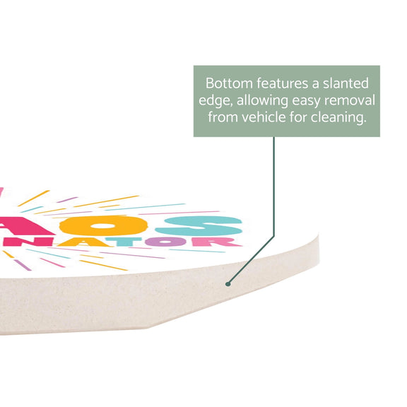 This witty and fun car coaster fits snuggly into your vehicle’s cup holders. Strategic divot on one side so they can be easily popped out. Pretty & practical – a pop of design and they keep your cup holders clean. 2.65” diameter. Absorbent ceramic coaster. Designed, printed and packaged in the USA