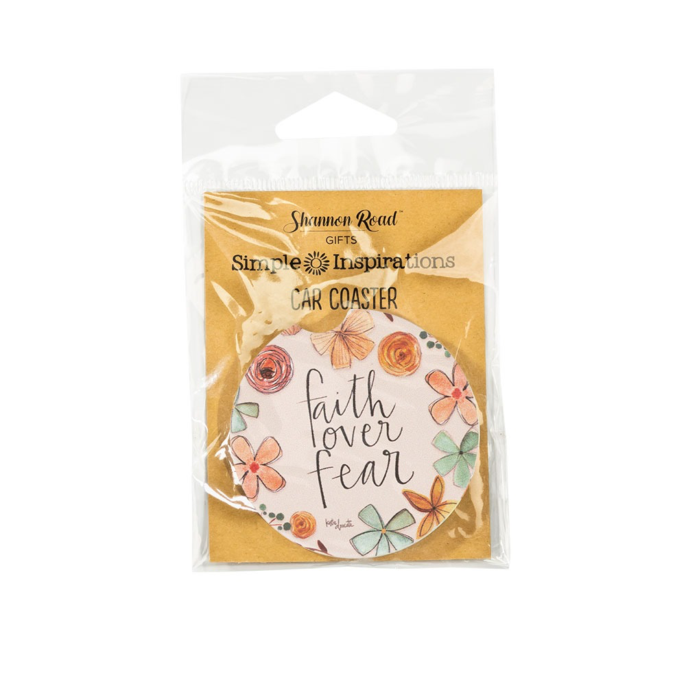 Simple Inspirations Car Coasters are made from absorbent stone o soak up leaks and spills with a sweet “Faith over fear” sentiment!!