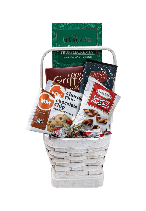 Sure to experience love at first bite, our chocolate inspired basket comes filled with all our favorite chocolate treats; including, individually wrapped gourmet chocolate truffles, chocolate pecan toffee, a gourmet chocolate truffle bar, chocolate chip cookies and chocolate wafer bites.