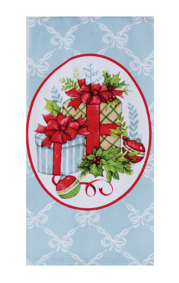 Add a touch of holiday cheer to your kitchen with this beautifully festive dishtowel. Featuring a stack of brightly wrapped presents adorned with red bows, holly, and ornaments, all framed against a soft blue patterned background, it perfectly captures the joy of Christmas morning. Both decorative and functional, this towel makes a charming seasonal accent or a thoughtful gift for anyone who loves holiday décor.