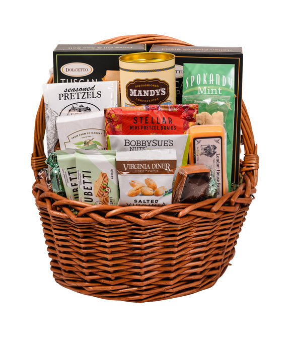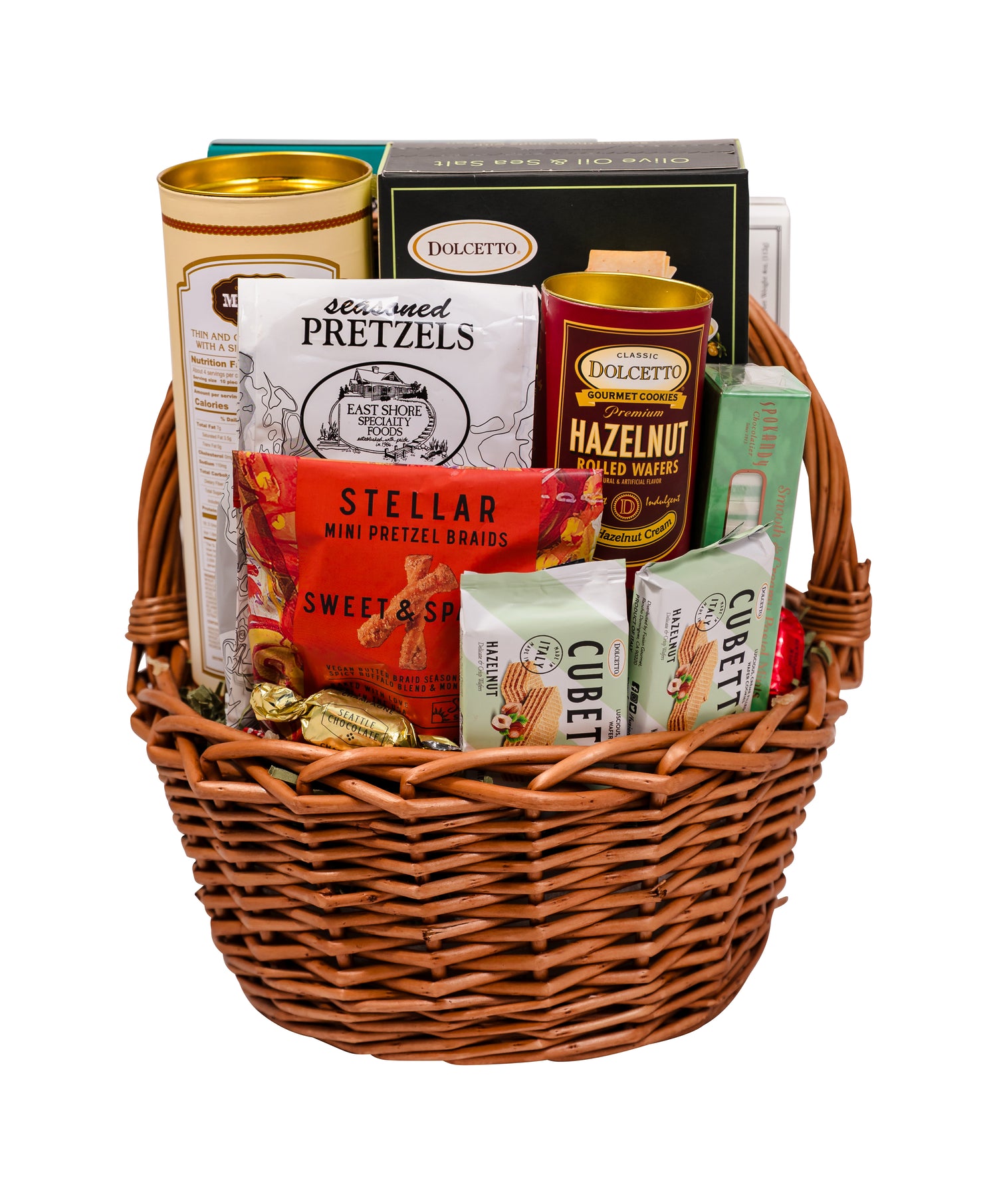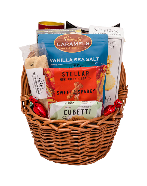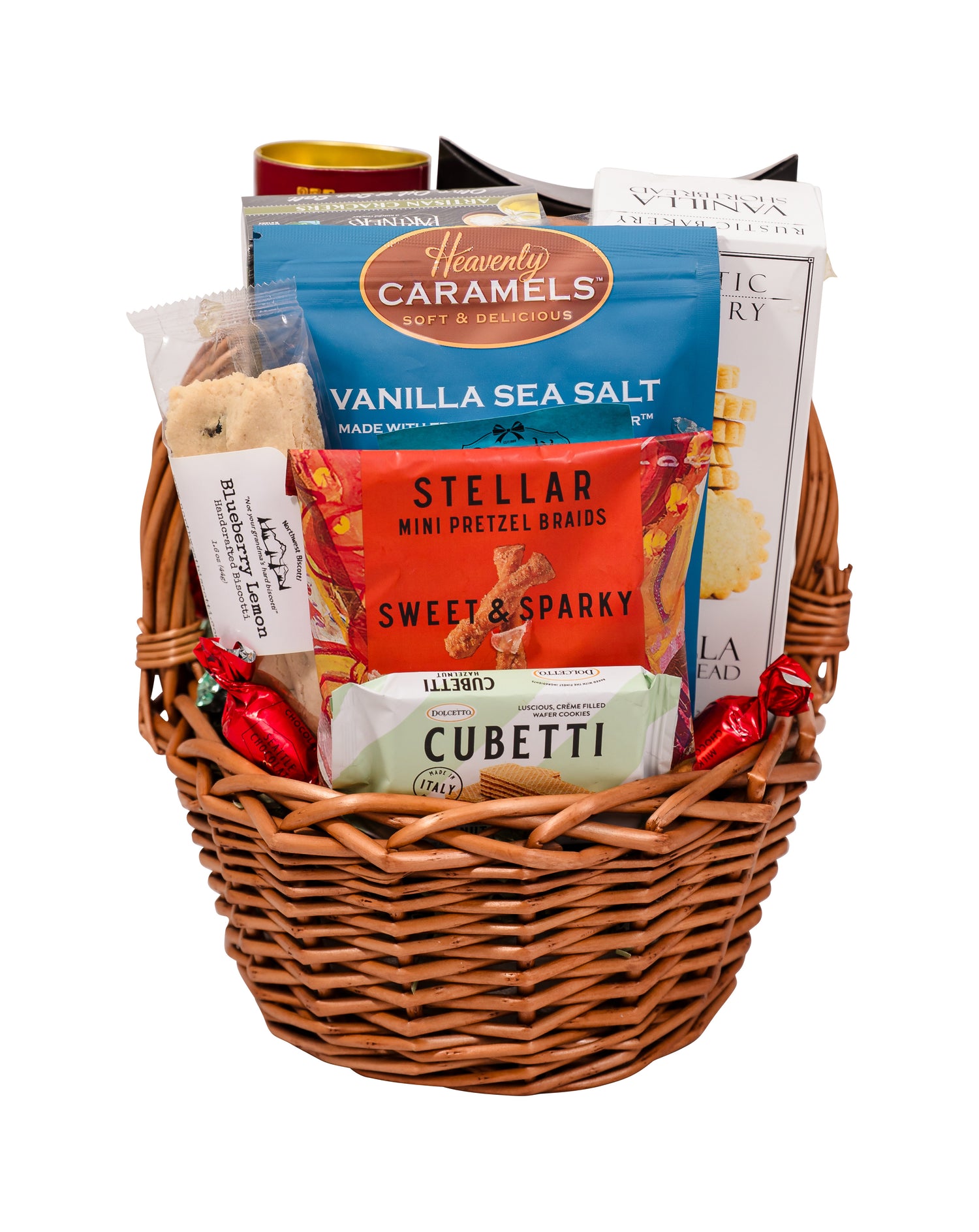 Our most popular holiday basket delivers the perfect combination of traditional favorites and indulgent treats. Inside, you’ll find savory essentials like smoked salmon, artisan cheese, gourmet crackers, and a flavorful sausage, perfectly paired with roasted salted cashews, almonds, and a Nuts Over Olives snack mix. To balance the savory, we’ve added sweet delights such as our signature Simply Soft Peanut Brittle. vanilla sea salt caramels, orange cranberry biscotti, buttery shortbread cookies, sweet & sparky pretzels, coffee-flavored toffee, and rich chocolate truffles. Thoughtfully curated, this basket is designed to impress and delight, making it the ultimate holiday gift for sharing joy and celebration.