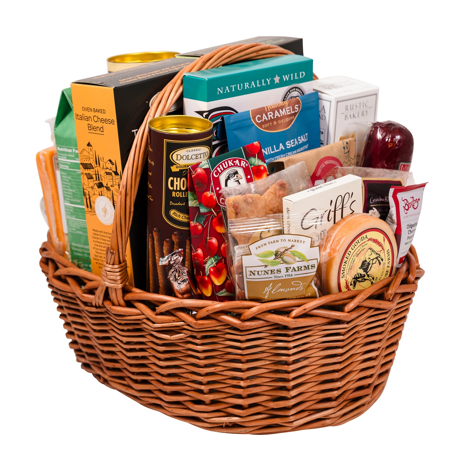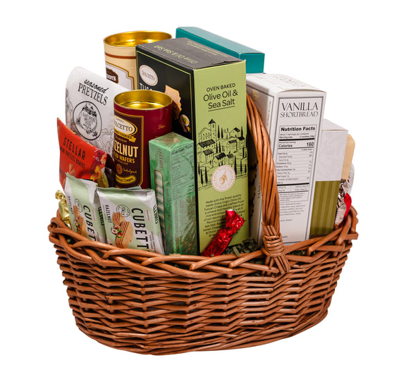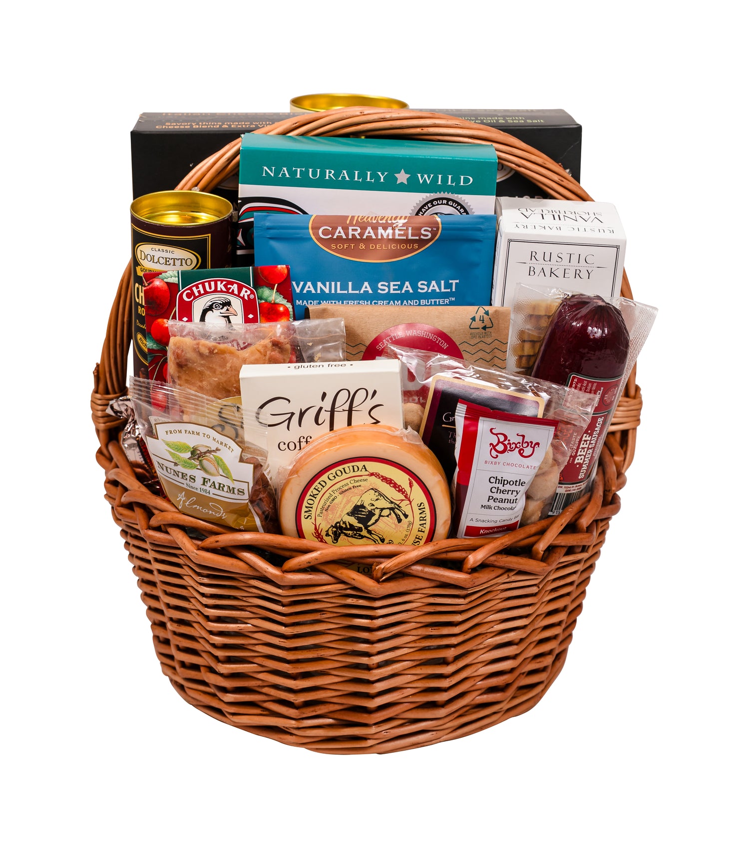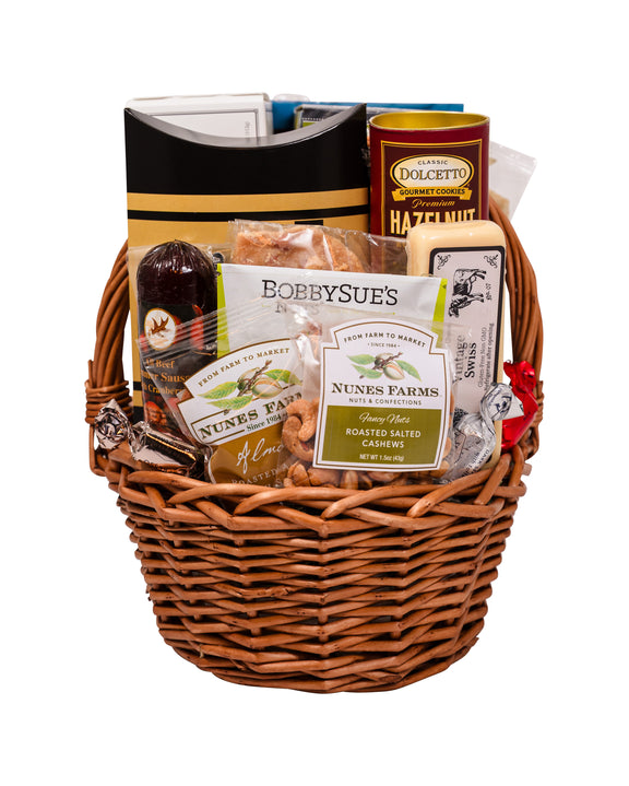 Our most popular holiday basket delivers the perfect combination of traditional favorites and indulgent treats. Inside, you’ll find savory essentials like smoked salmon, artisan cheese, gourmet crackers, and a flavorful sausage, perfectly paired with roasted salted cashews, almonds, and a Nuts Over Olives snack mix. To balance the savory, we’ve added sweet delights such as our signature Simply Soft Peanut Brittle. vanilla sea salt caramels, orange cranberry biscotti, buttery shortbread cookies, sweet & sparky pretzels, coffee-flavored toffee, and rich chocolate truffles. Thoughtfully curated, this basket is designed to impress and delight, making it the ultimate holiday gift for sharing joy and celebration.
