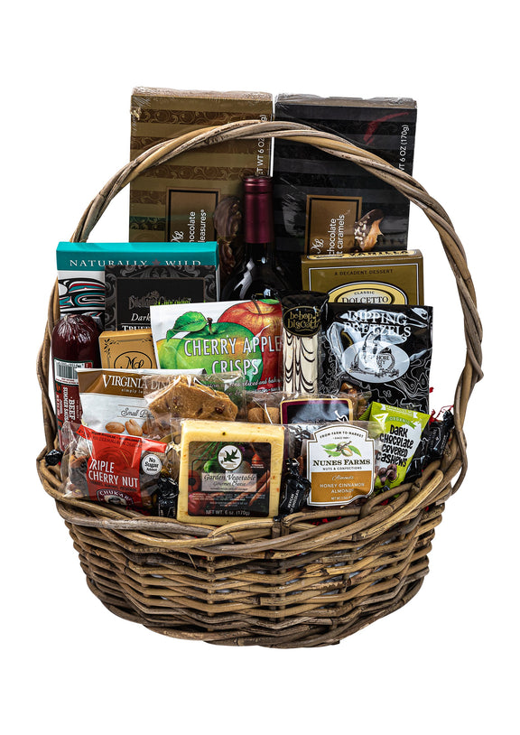 This traditional selection is the perfect combination of our best-selling meats and sweets. This basket comes loaded with smoked salmon, cheese, crackers, savory sausage, our famous soft peanut brittle, gourmet pretzels, our best selling Grandma Rubin's Peppernuts gingersnap cookies, nuts, a bottle of Northwest wine, a variety of gourmet chocolates, cookies, candies, and more!