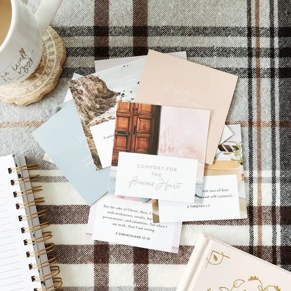 This set of 11 cards includes 10 cards designed to help you pray for anxiety and worry in your life, and a cover card. One side of the cards contains a Scripture that pertains to anxiety or worry, and the other side has a prompt to help you pray, journal, and meditate on truth to combat anxiety and worry.