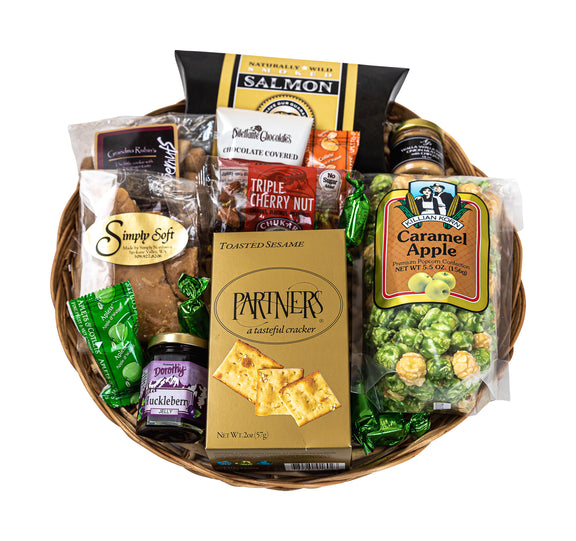 Our beautiful state is home to some of the most distinct specialty foods and flavors and we've captured them insides this warmhearted selection. Each basket comes filled with smoked salmon, gourmet caramel apple popcorn, savory crackers, our famous soft peanut brittle, Walla Walla sweet onion mustard, a huckleberry chocolate bar, cherry apple crisps, Aplets and Cotlets fruit and nut candies, huckleberry jam, gourmet chocolates and more.