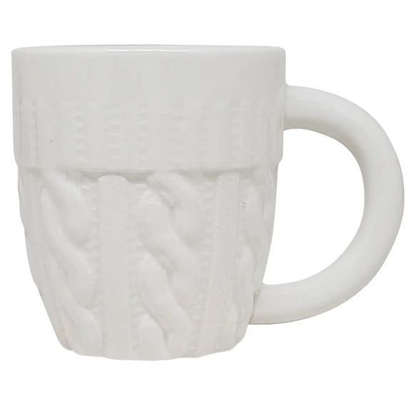Add cozy charm to your holiday mugs assortment with our 18oz Sweater Patterned Christmas Mug. Featuring a textured cable knit design, this festive coffee mug is perfect for holiday coffee, cocoa, or tea. It pairs effortlessly with holiday decorations and holiday accessories for a warm, nostalgic seasonal display customers will reach for all winter long. DETAILS: • 18oz Ceramic Style Mug • Size: 4.20" H x 3.85" W (5.60" w/ handle) • Glossy Cream Color with Sweater Detailing • Lead Free, Cadmium Free • Designed in the USA, Imported
