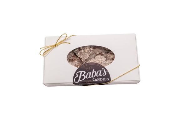 There is no shortage of almonds here! Made only with REAL butter and pure cane sugar, infused with chopped almonds, this satisfyingly crunchy, melt-in-your-mouth almond toffee is topped with just the right amount of premium dark chocolate (63%+ cacao), and more crushed almonds. As always, made with love by Baba herself!