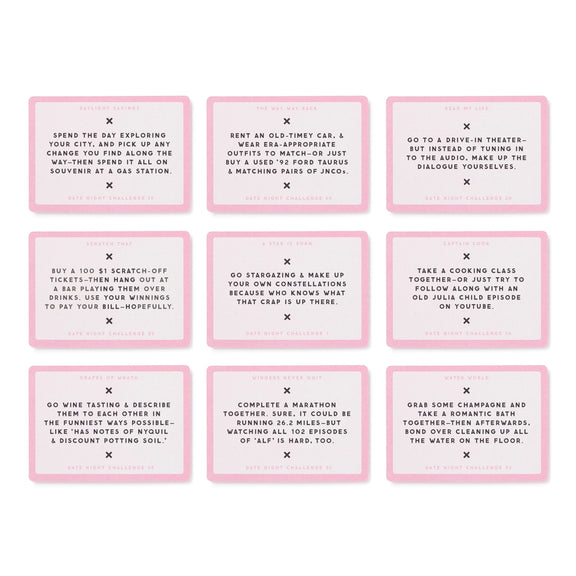 Date Night Challenges is the perfect accessory for your next date night. It’s hard enough to pick a place to eat–let alone come up with something unique and fun to do on date nights. This collection of 100 quirky, yet endearing, date night ‘challenges’ take the pressure off. We’ll do all the hard work–just draw one at random, and if the date sucks you can just blame us. It’s a win-win for everyone. Use them for everything from first dates, to first-date-night-away- from-the-kids-in-a-billion-years.