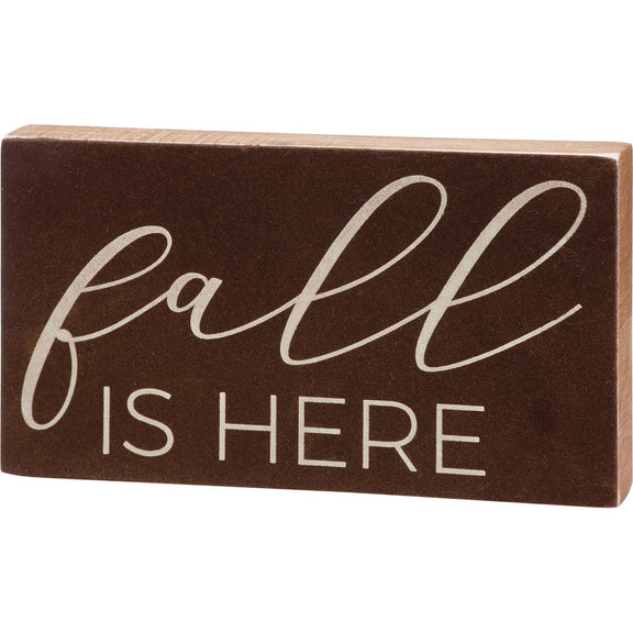A wooden block sign that makes a bold statement for the start of autumn. Featuring natural wood stained sides with "Fall Is Here" sentiment on a dark brown velvet background. Our Fall Is Here block sign is easy to hang via predrilled keyhole slot or can free-stand alone.