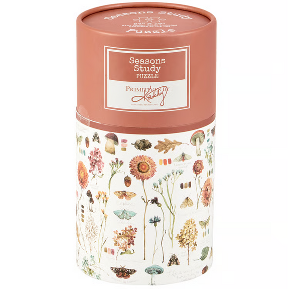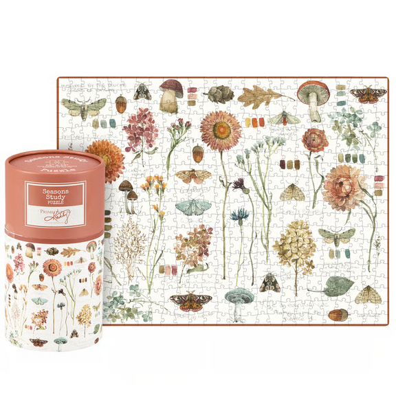 A 500 piece puzzle displaying a pattern of fall nature designs with accents of study notes. Design is replicated from original art hand painted in a delicate watercolor style. Puzzle pieces are packaged in a resealable plastic bag and enclosed in a cylindrical box with the design displayed around outside and a descriptive "Seasons Study Puzzle" sentiment on lid. Our Fall Study puzzle includes a printout of full puzzle image for reference. Contains small parts; this is not a toy. A fall-themed accessory great for seasonal gifting.