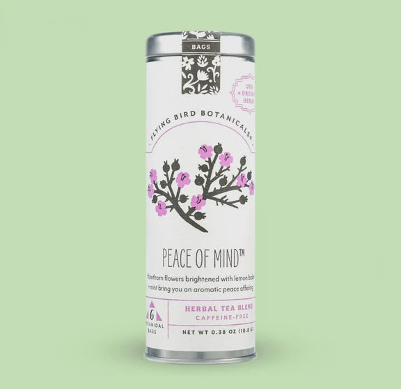 An aromatic peace offering from Flying Bird to you and your loved ones. Hawthorn flowers are brightened with lemon balm and mint to soothe and comfort with each sip. This tea is 100% grown and gathered in the Pacific Northwest. One of our favorites for closing the day, the lemony minty blend sooths and calms while supporting the nervous system. Find your Peace of Mind in a warm cup of tea.