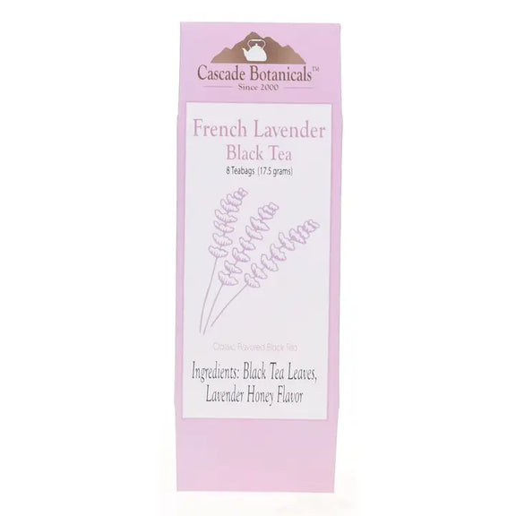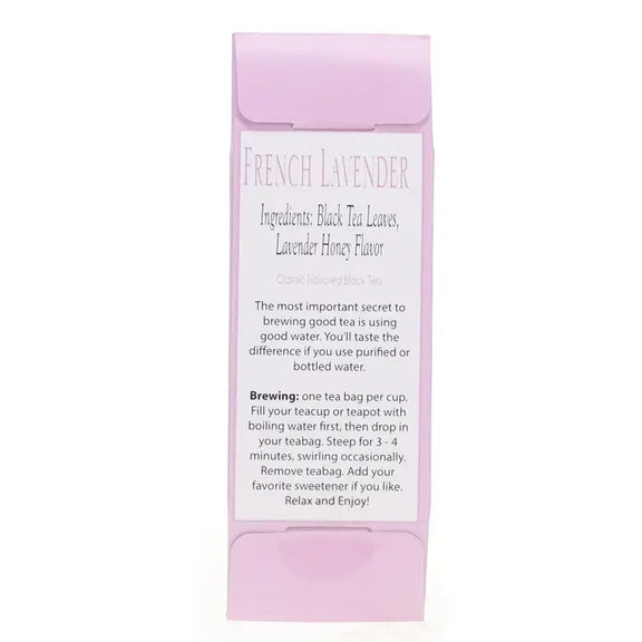 FRENCH LAVENDER BLACK TEA BOX (8 Tea Bags) Ingredients: Black Tea Leaves, Lavender Honey Flavor. Gift Box Dimensions 2-1/2" x 1" x 7-1/2"