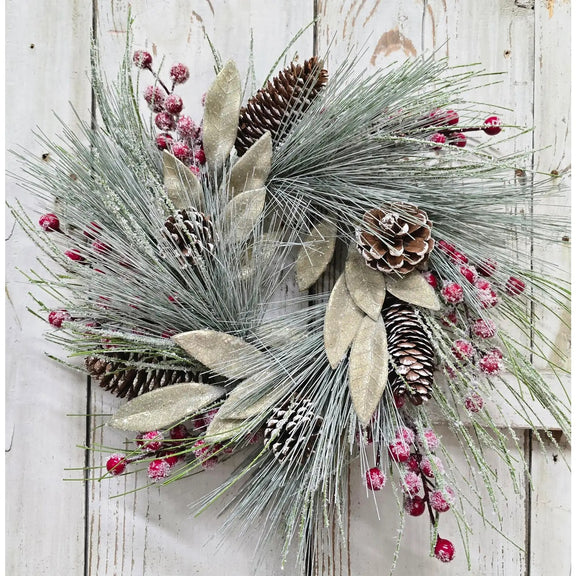 Bring the beauty of winter indoors with this frosted holiday candle ring. Featuring snowy pine branches, frosted red berries, golden leaves, and pinecones dusted with glittery snow, this piece adds a warm and festive touch to any space. Perfect for framing your favorite pillar candle, it creates an inviting holiday centerpiece for tables, mantels, or entryways.