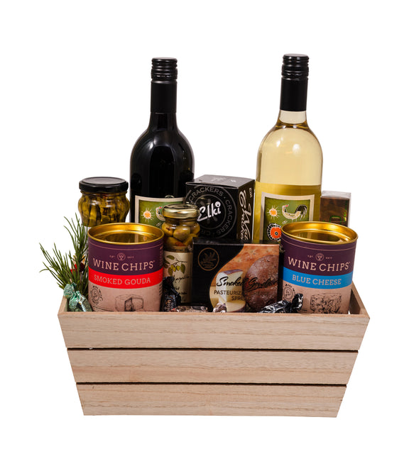 Treat them to a true celebration of flavor with our Grand Pairing Gift Basket - the perfect choice for wine lovers and food enthusiasts alike. Thoughtfully arranged in a modern wooden crate, this gourmet gift pairs fine wines with an exceptional assortment of savory and satisfying treats.