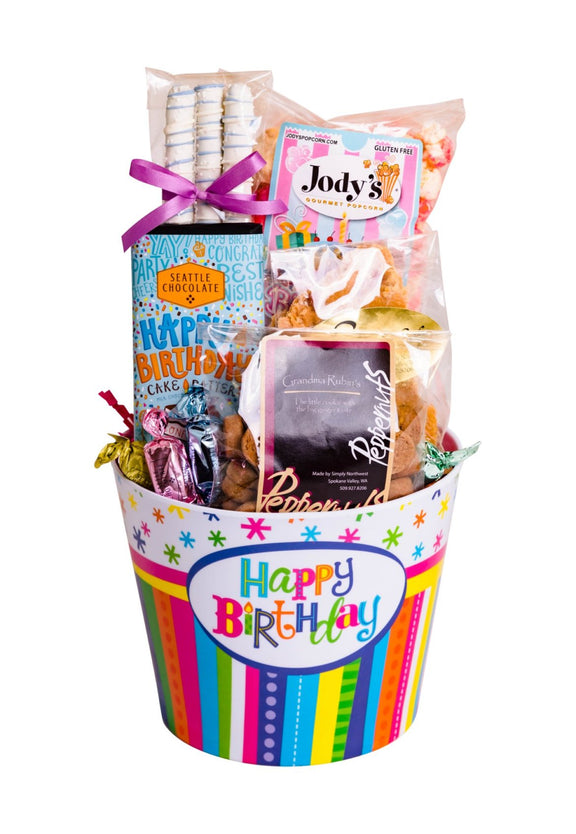 A bucket full of Birthday fun! Included inside this festive reusable bucket is our best selling birthday cake popcorn, birthday cake batter gourmet chocolate bar, and a variety of delicious cookies and candies.