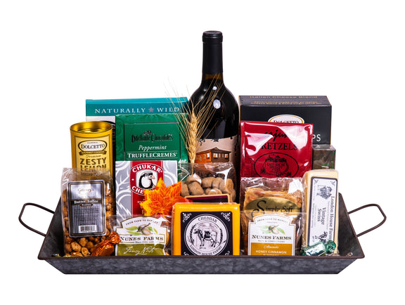 Send a bountiful of Autumn treats with our Fall inspired gift. Built on top of a beautiful Sunflower design tray is a bottle of red wine, cheese, crackers, seasoned pretzels, our famous soft peanut brittle, butter toffee peanuts, chocolate covered Bing cherries, best-selling Spokandy dinner mints, our exclusive Grandma Rubin's Peppernuts gingersnap cookies, gourmet chocolates and more.