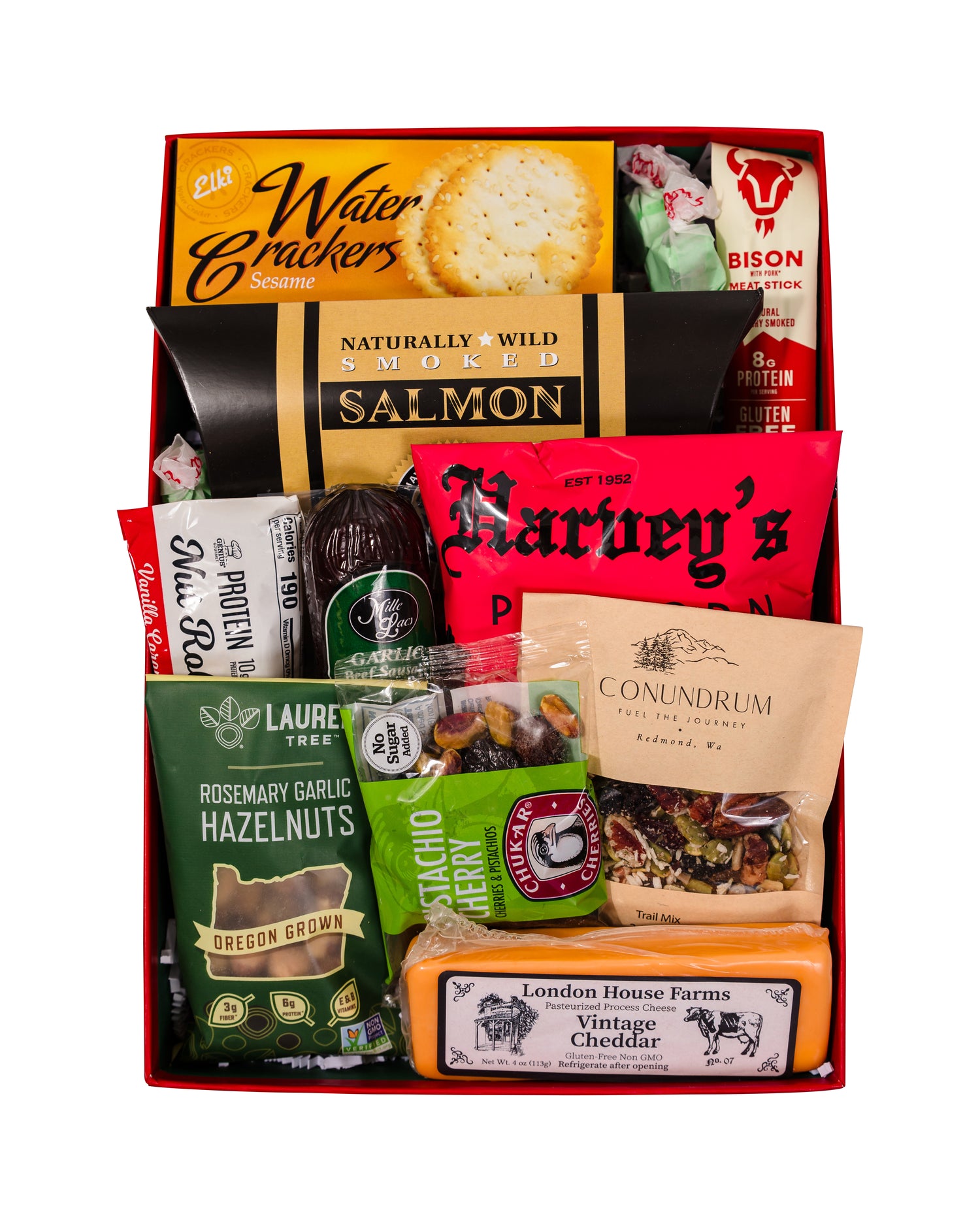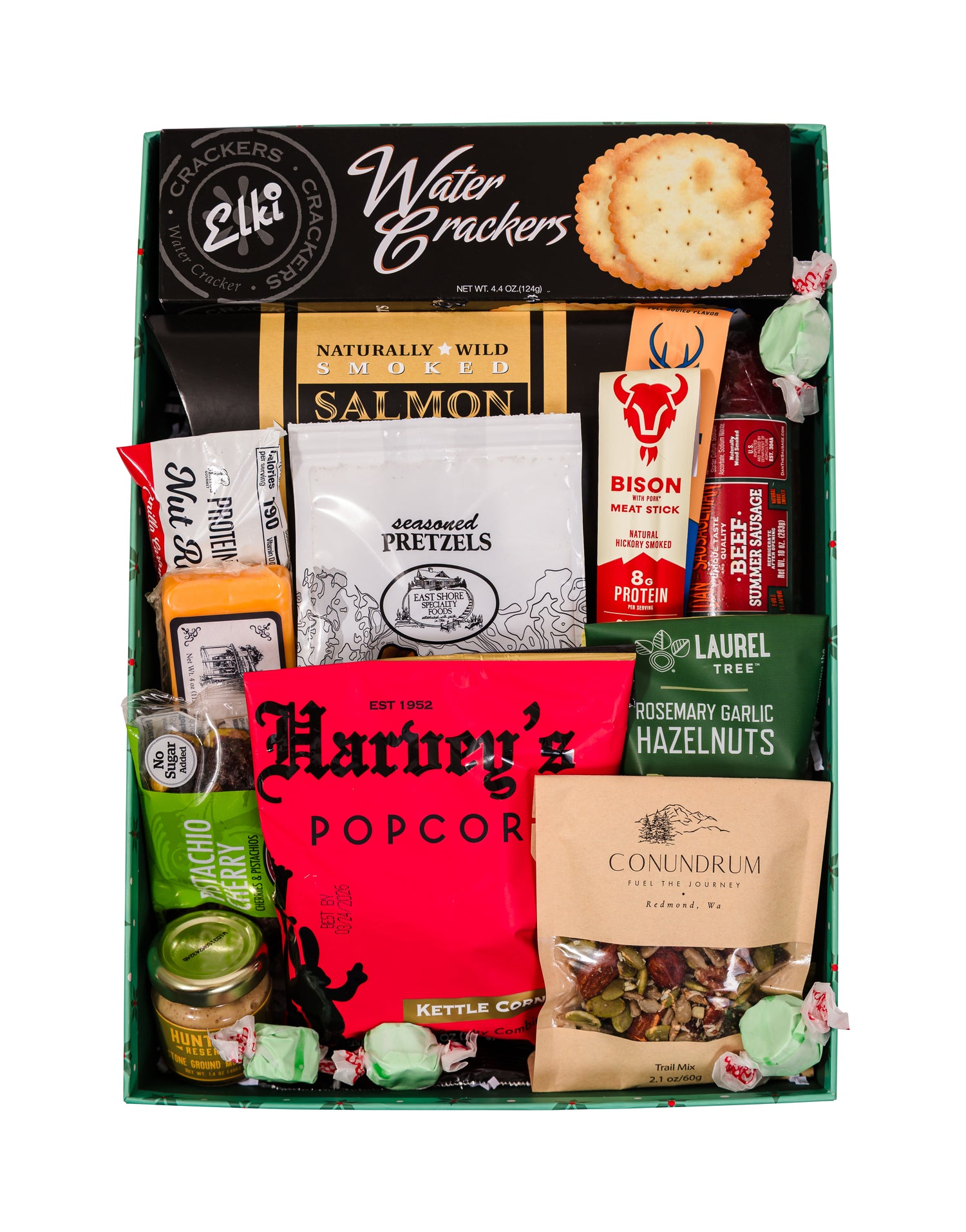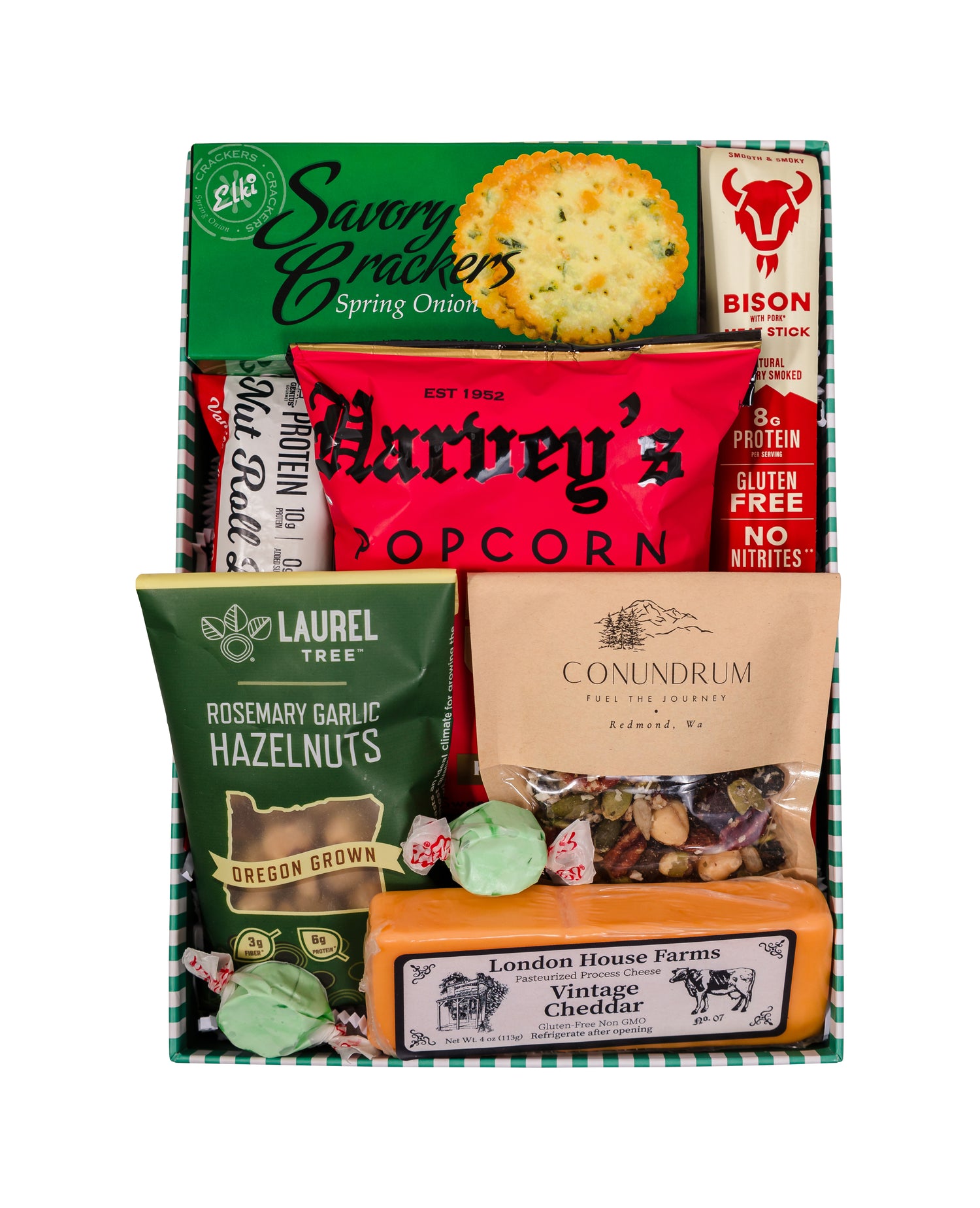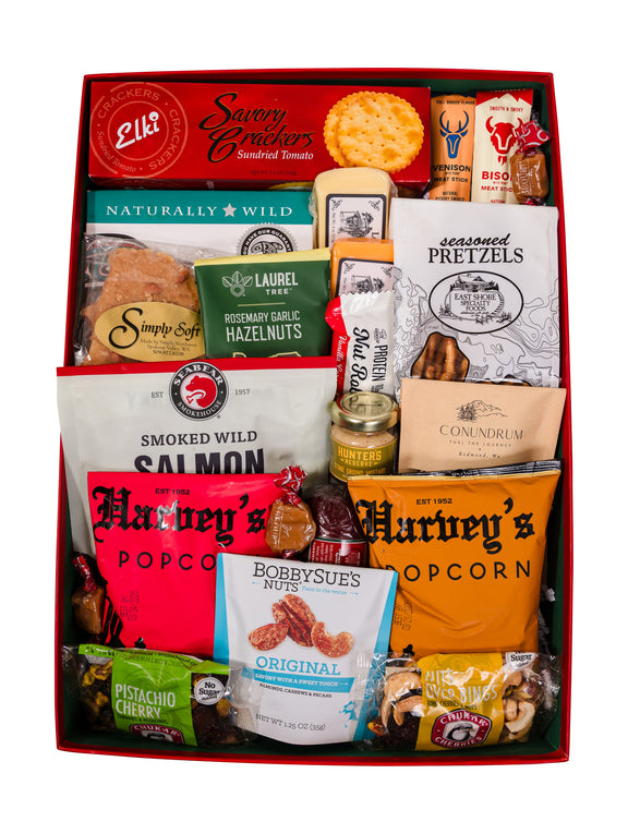 Give the gift of bold flavors and hearty snacking this holiday season! This gift is stocked full of favorites like savory crackers and cheese, a protein-packed meat stick, crunchy trail mix, garlic-roasted hazelnuts, gourmet popcorn, a classic nut roll bar, and more. Thoughtfully curated with a mix of salty, savory, and satisfying bites, it’s the perfect holiday surprise for those who appreciate good food and great snacks.