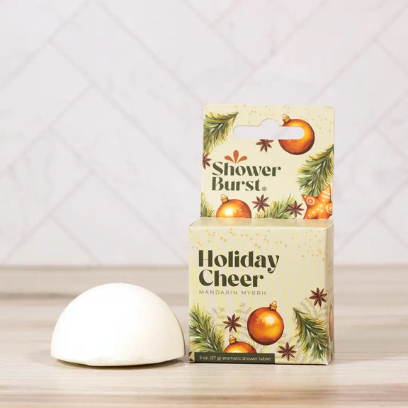 Unwrap the spirit of the season with Holiday Cheer, a festive blend of warm Mandarin and rich Myrrh that fills your shower with cozy, comforting vibes. Our new Shower Burst® Aromatic Tablet offers a fresh twist on the original—crafted with high-quality fragrance oils for a longer-lasting, indulgent scent experience. Just add water to activate and let the steam carry you into holiday bliss. Packaged for gifting, perfect for stocking stuffers, holiday gifts, host presents, or a little self care treat for yourself.