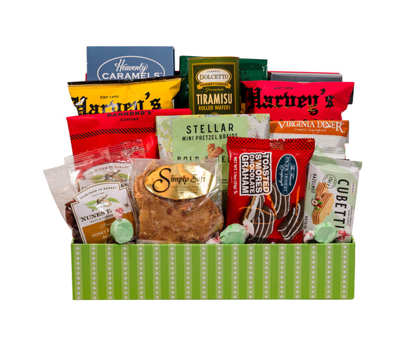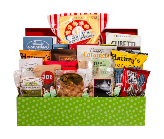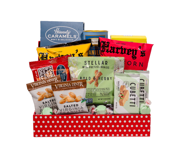 Bring instant holiday cheer with this shareable basket packed full of festive flavors and ready-to-enjoy treats. From buttery lemon shortbread cookies and crunchy kettle corn to milk chocolate sea salt caramels, bold herby pretzels, and chocolate-covered s’more grahams, every bite is a crowd-pleaser. With its mix of sweet and savory favorites, this no-prep gift is perfect for groups, offices, or anyone who loves to snack their way through the season.