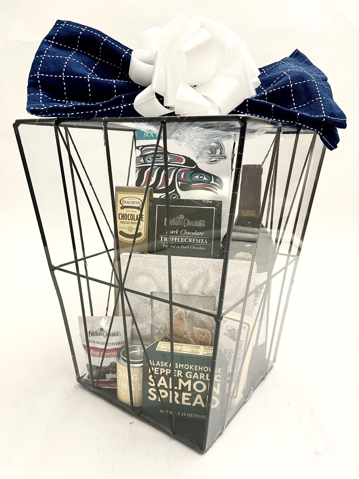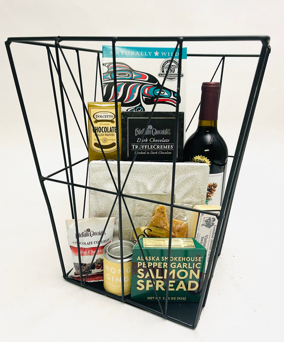 Our gorgeous black metal basket makes a perfect addition to any home or office and comes filled with a large array of enticing items, including; a bottle of wine, keepsake photo frame, a dishtowel to match the current season, aromatic candle, gourmet chocolates, smoked salmon, cheese, crackers, and other appealing treats.