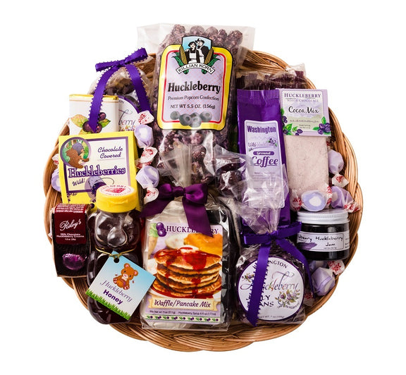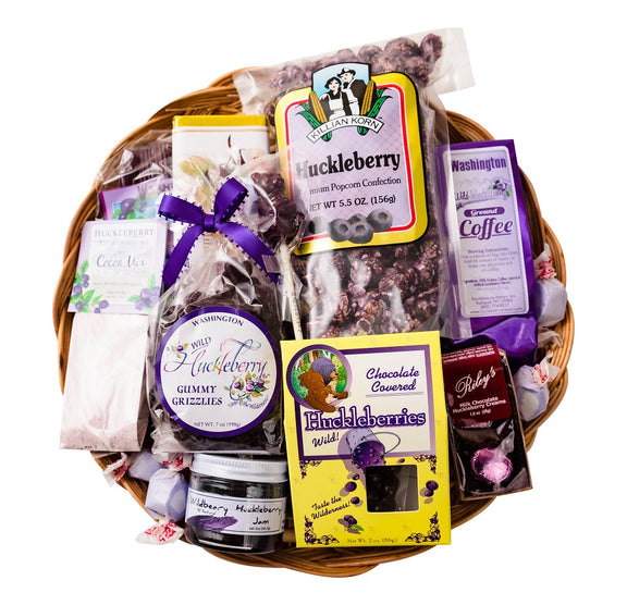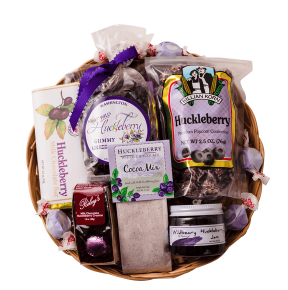 Share a Northwest favorite with our medley of huckleberry delicacies. This heartwarming array of delicious homegrown huckleberry goodness includes our most popular huckleberry treats; including huckleberry gourmet popcorn, candy bark, jam, cocoa, milk chocolate huckleberry creams, and a lovely variety of huckleberry candies
