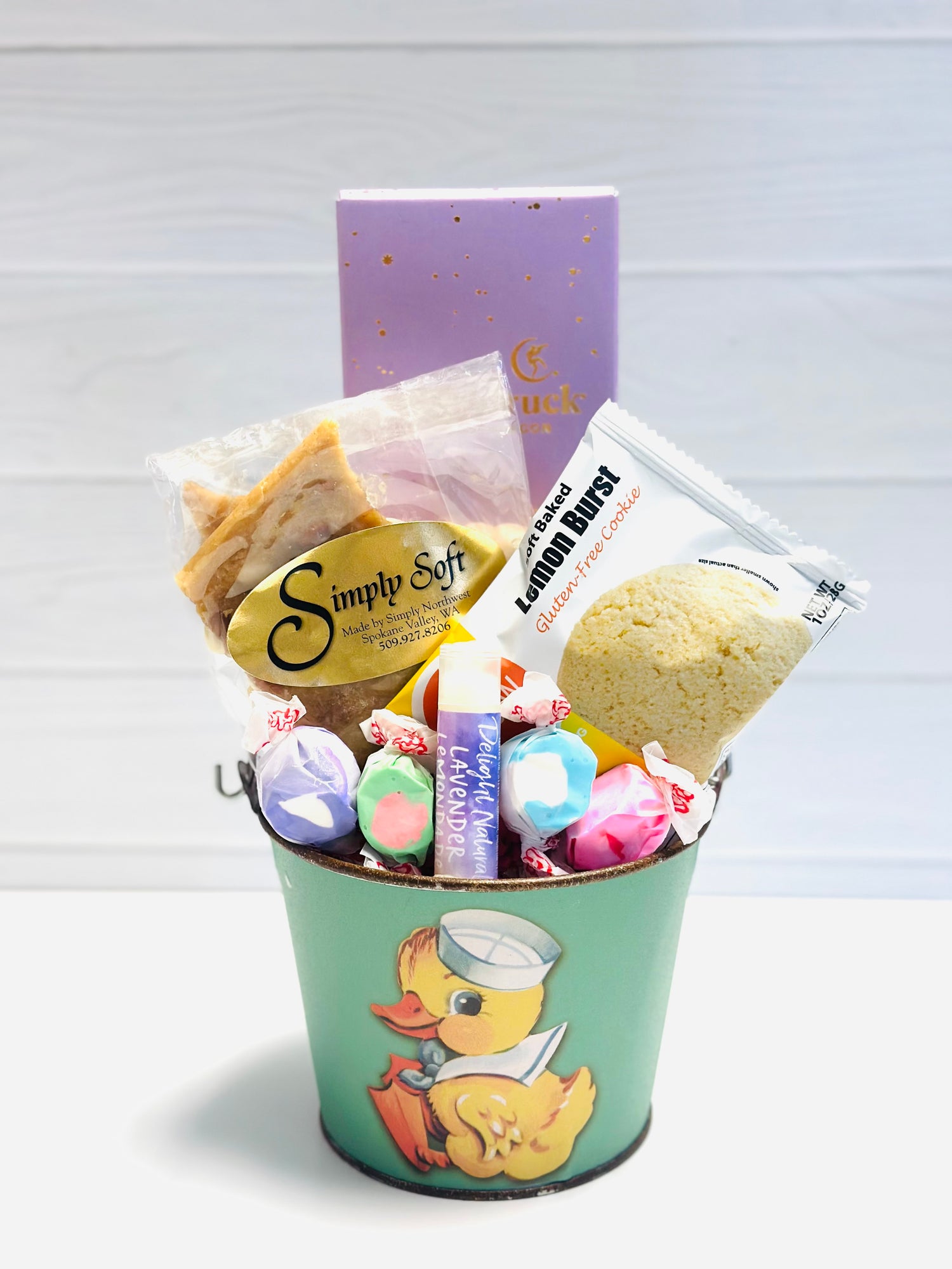 This adorable mini Easter pail is packed with sweet surprises to make anyone’s Easter extra special! Inside this charming pail, you'll find a delightful mix of gourmet indulgences, including rich, velvety chocolate, our famous soft peanut brittle, a deliciously baked cookie, and chewy, flavorful taffy—all perfect for satisfying any springtime sweet tooth. Plus, we've added a festive, moisturizing lip balm for a little extra treat beyond the sweets!