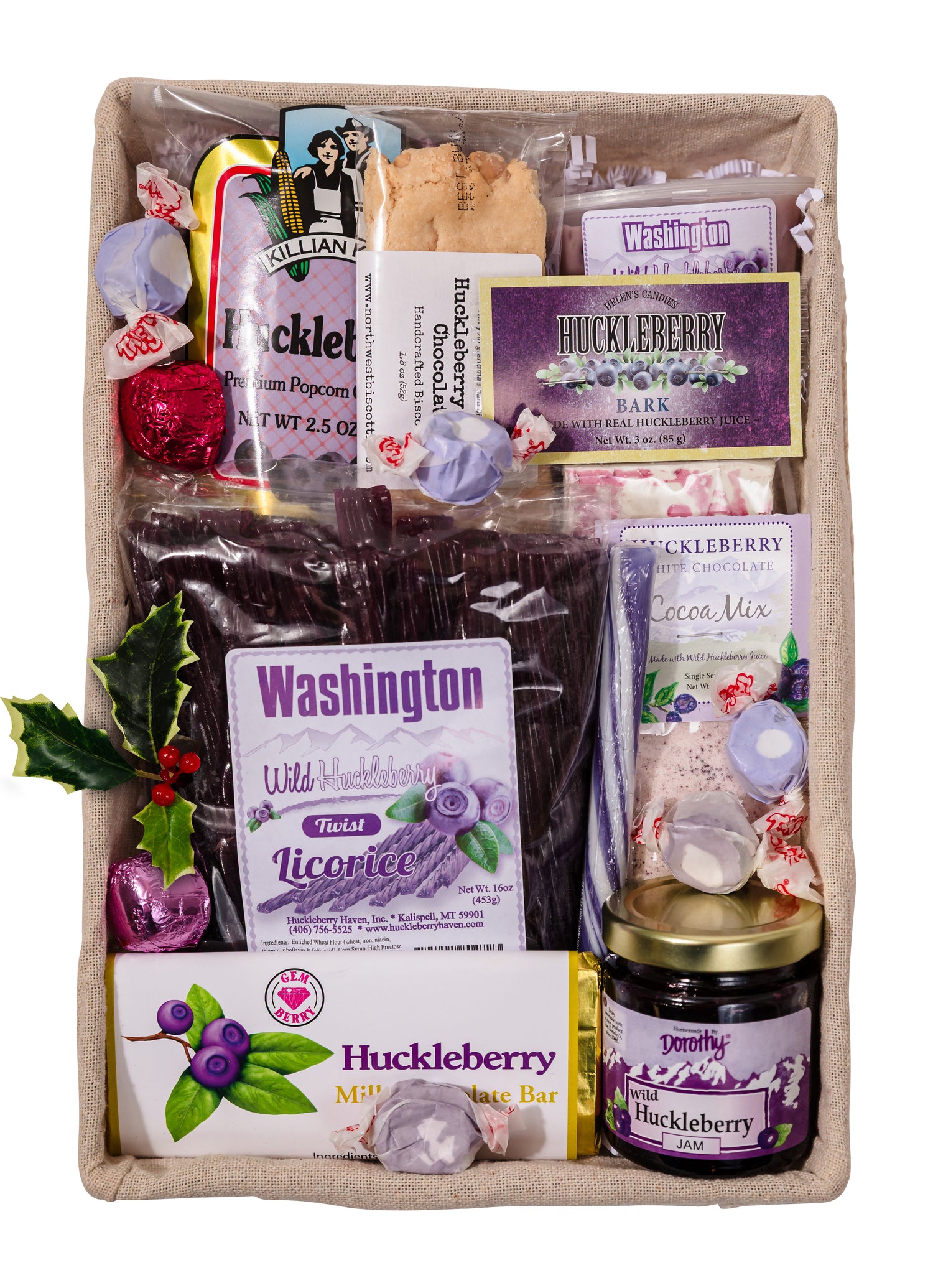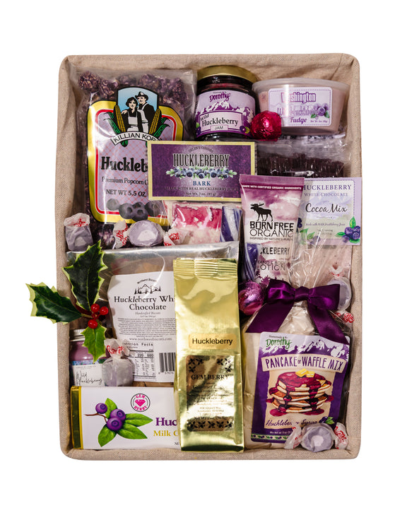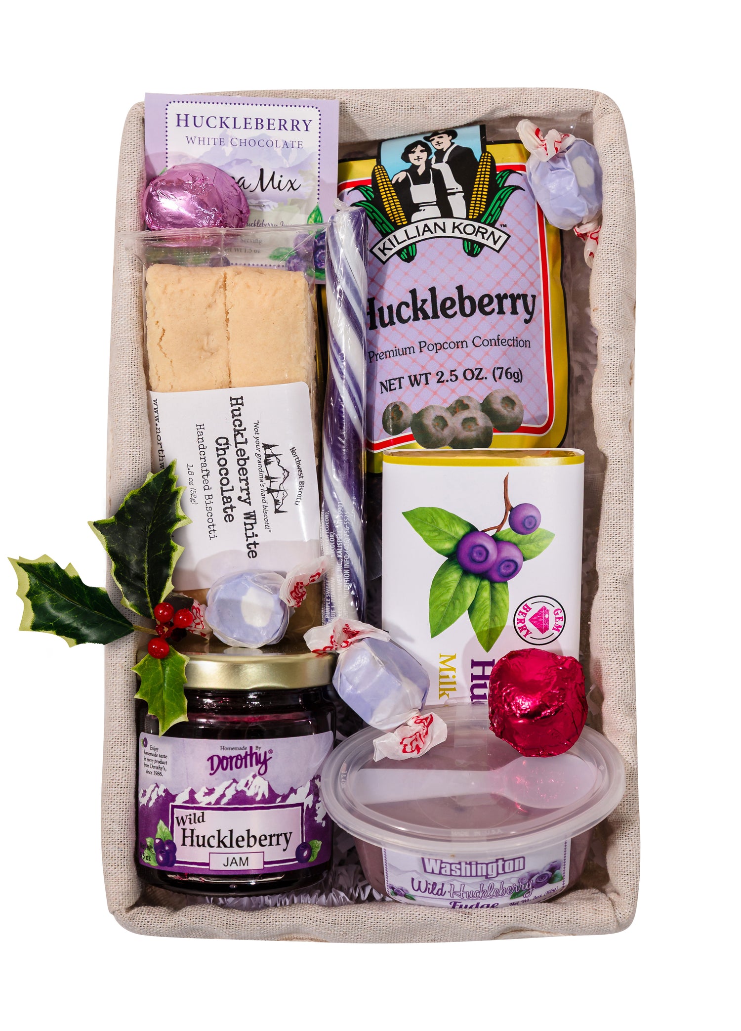 Celebrate the season with a taste of the Northwest’s most treasured and elusive berry. This beautifully curated gift basket features an array of gourmet huckleberry delights - from rich cocoa and handcrafted biscotti to popcorn, preserves, candies and decadent chocolates.