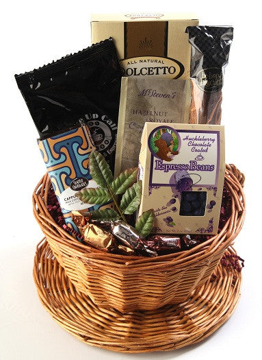 This fun coffee themed gift is built inside our keepsake willow coffee cup and saucer basket. Your sweetie is sure to enjoy a packet of Northwest coffee, huckleberry chocolate covered espresso beans, a gourmet Cappuccino flavored chocolate bar, biscotti, and many more coffee themed treats.