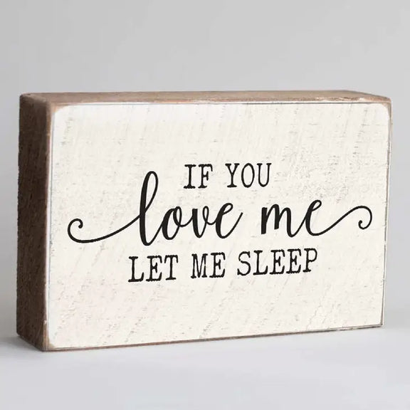 The If You Love Me Let Me Sleep Decorative Wooden Block adds flair as a wooden shelf sitter, tabletop or mantel decoration.