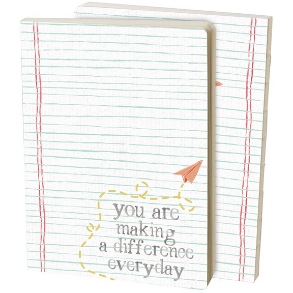 A double-sided journal displaying a lined paper design with paper airplane and inspirational inspired sentiment that reads "You Are Making A Difference Everyday." Back cover displays a coordinating lined paper design. Journal design is replicated from original artwork hand painted in a unique watercolor style. Our Making A Difference journal includes 160 lined pages and an open spine to lay flat for easy use when writing. An inspirational gift perfect for an everyday accessory.