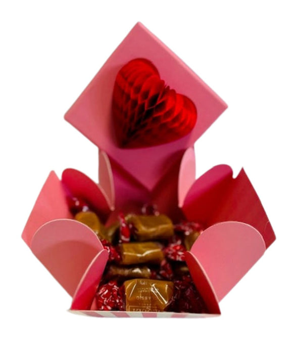 Indulge in the ultimate Valentine's Day treat with our collapsible reuse able heart gift box, beautifully filled with decadent buttery soft caramels.