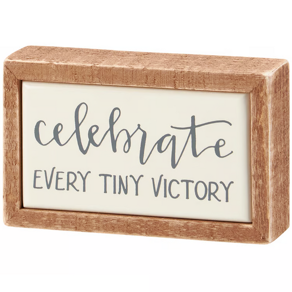 A small wooden box sign displaying an inspirational sentiment in a unique hand illustrated style that reads "Celebrate Every Tiny Victory." Box sign features a natural wood frame and faux enamel finish behind design for a tile-like appearance. Our Celebrate mini sign is easy to hang or can free-stand alone. An inspirational gift perfect as an everyday home accent that can easily blend into any display.