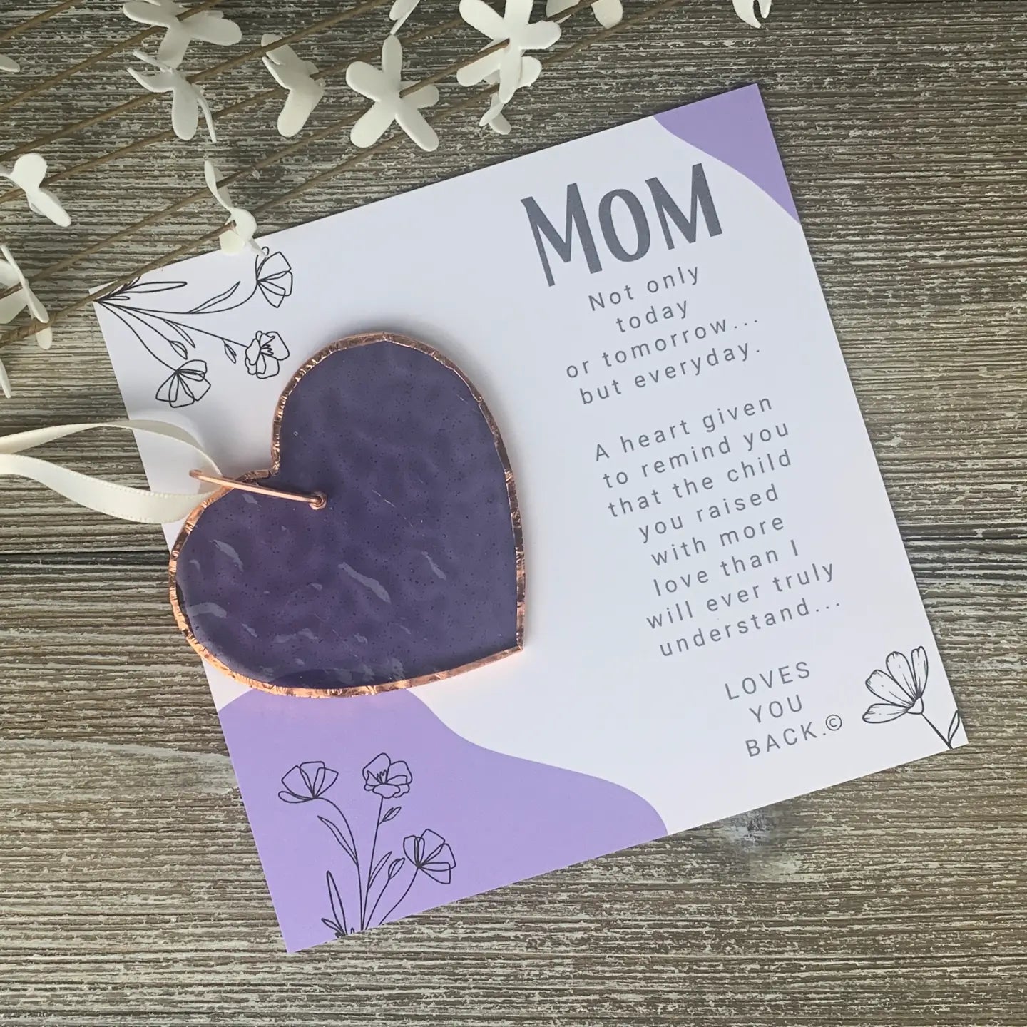 Do you need a gift for mom that tells her how much you love and appreciate her? This beautiful textured stained glass periwinkle heart ornament is handmade in the USA. The 3" glass heart is lined with copper edging and features a copper ring with satin ivory ribbon for hanging. Each handmade heart is paired with a touching sentiment written by Teri Harrison. The sentiment is printed on quality cardstock paper and presented in a 5.25"x5.25" white linen box with a clear lid. All components made in the USA. Hang or display at any time of year.