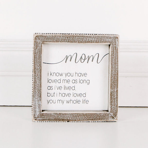 Looking for a Mother's Day gift? This wood sign is a great option to look at! Displaying a heart-warming message saying, "Mom I Know You Have Loved Me As Long As I've Lived, But I Have Loved You My Whole Life", this framed sign will surely help you express your love and gratitude to your mother. It measures 5" by 5" by 1.5" and would look great either hanging or freestanding. It uses neutral colors like gray and white which can blend well with any home or office design.