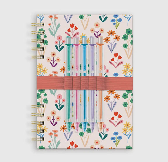 Never lose another penagain! This 192 page hardcover note Features convenient elastic loops on the cover That comes stocked with five multicolored pens.