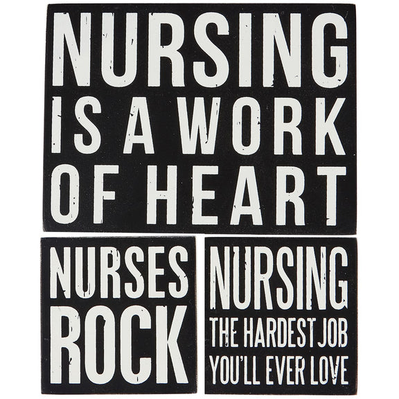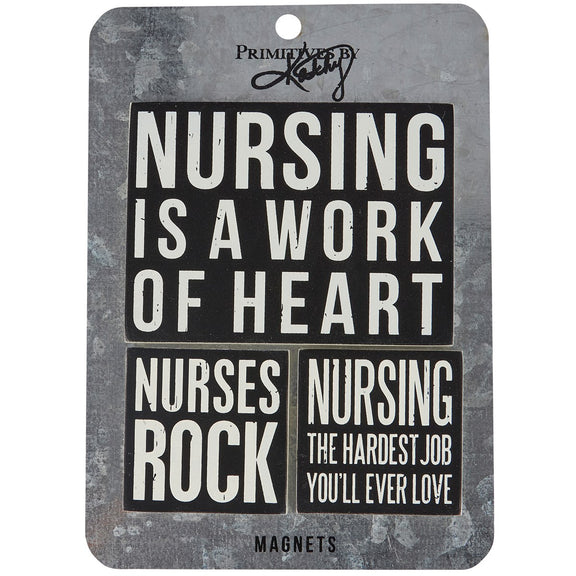 A set of three wooden magnets displaying fun nurse inspired sentiments on each in a classic black and white box sign style. Sentiments read "Nursing Is A Work Of Heart," "Nurses Rock," and "Nursing - The Hardest Job You'll Ever Love." Packaged on a galvanized metal card inside a poly bag. An inspirational nurse-themed gift perfect for everyday home or office display.