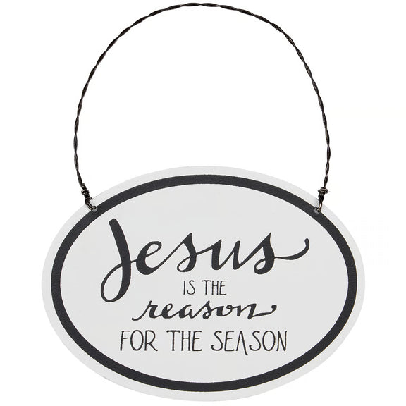 A galvanized metal ornament displaying a faith inspired seasonal sentiment in a hand illustrated style that reads "Jesus Is The Reason For The Season." Our Jesus Is The Reason ornament is ready to hang via attached twisted wire hanger. A rustic Christmas home accent perfect for a Christmas tree or for seasonal decorating.