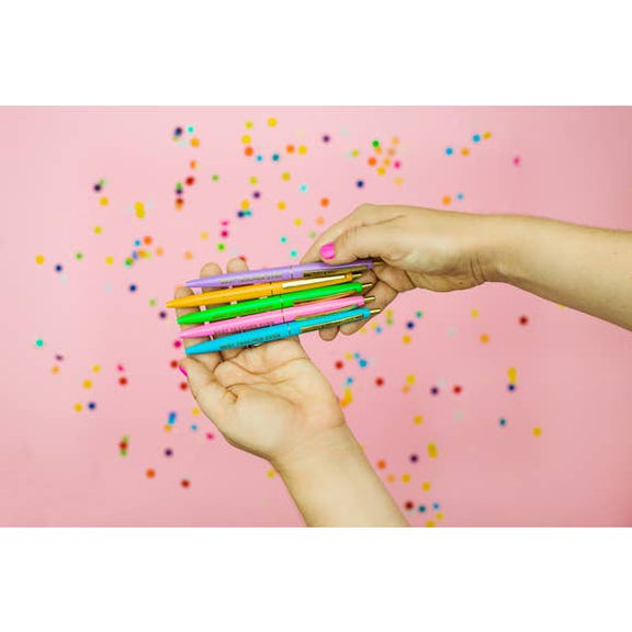 Set includes 5 pens in the colors shown Pen color has matching ink color: Green pen has green ink Purple pen has purple ink Pink pen has pink ink Blue pen has blue ink Orange pen has orange ink Medium ball point Packaging is a white box with gold foil dots Box size is 5" x 7.5" x .75"
