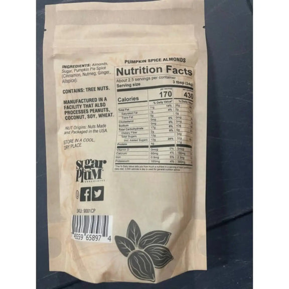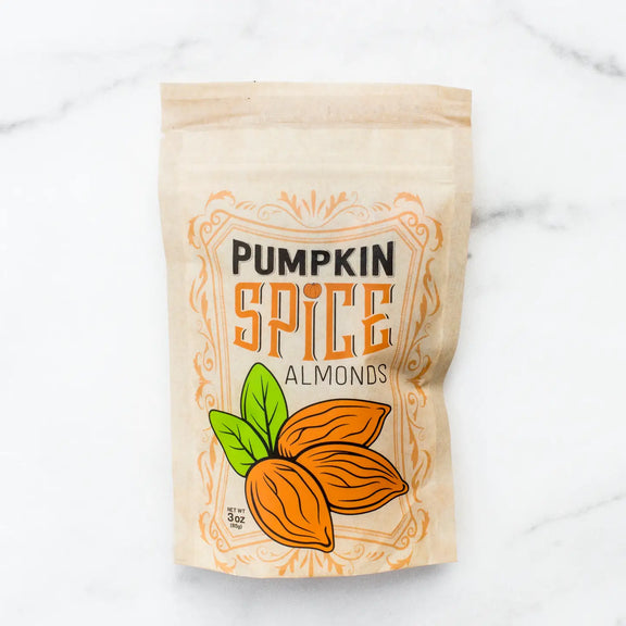 Get your fall fix year-round with our kettle-cooked Pumpkin Spice Almonds. The gourmet nuts are vegan and dairy-free. This tasty snack has a crunchy texture with a distinct flavor that many love. Pumpkin Spice Almonds are the perfect autumn treat to go nuts for! We use a specially handcrafted recipe. Our artisans generously coat the almonds with a flavorful blend of spices. Cinnamon, ginger, nutmeg, and other exotic seasonings bring out the flavors. Our Pumpkin Spice Almonds have a taste that is second to one! Capture the essence of fall and your love for autumn with this snack! The nuts are kettle-cooked making them dairy-free and devoid of unhealthy fats and oils. Our Pumpkin Spice Almonds offer fall in every bite. The guilt-free munchies are indulgent throughout the year. Every bag of these gourmet nuts is 3 oz.