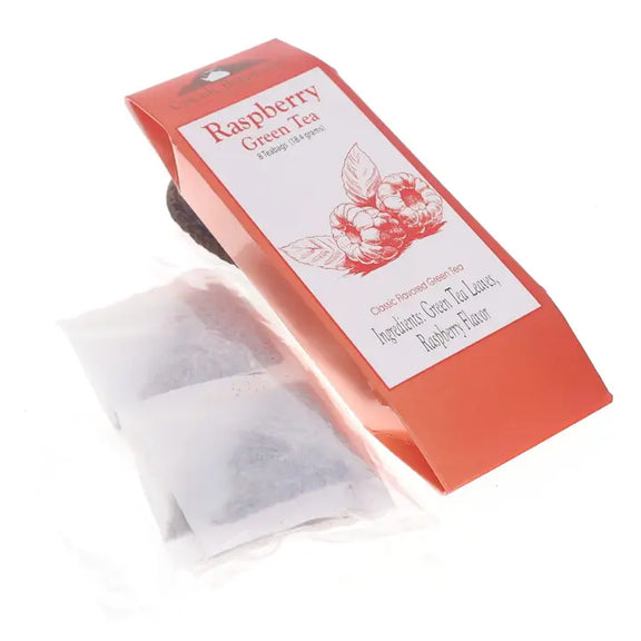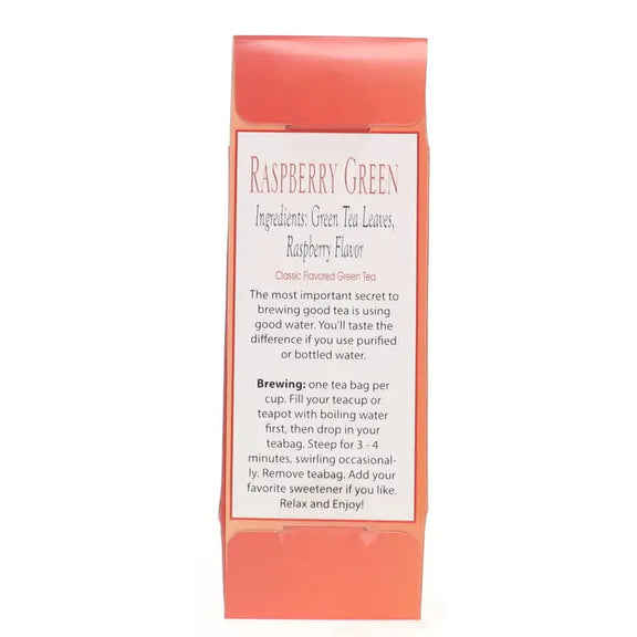 RASPBERRY GREEN TEA BOX (8 Tea Bags) Ingredients: Green Tea Leaves, Raspberry Flavor. Gift Box Dimensions 2-1/2" x 1" x 7-1/2"