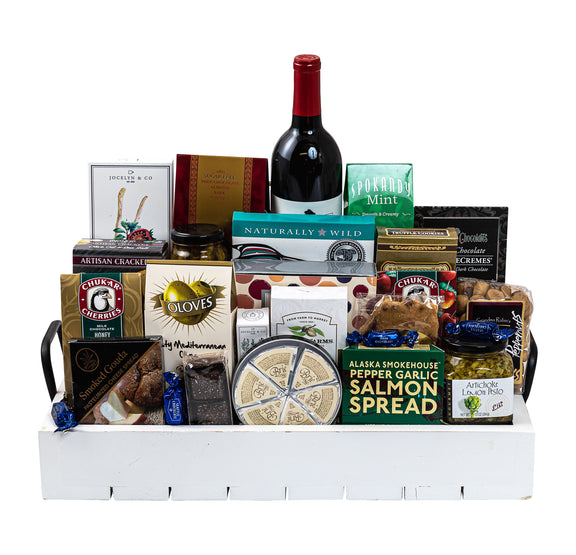 When wanting to leave a lasting impression send this beautiful and elegant gourmet gift basket filled with our most elite treasures. They are sure to enjoy the smoked salmon, savory crackers, grilled asparagus spears, smoked Gouda cheese, premium nut mix, gourmet chocolate truffles, our famous soft peanut brittle, chocolate covered cherries, savory snack olives, gourmet pretzels, a bottle of Northwest red wine, and many other delicacies. *please note the tray shown in the photo may not be the one used for your order depending on current inventory.