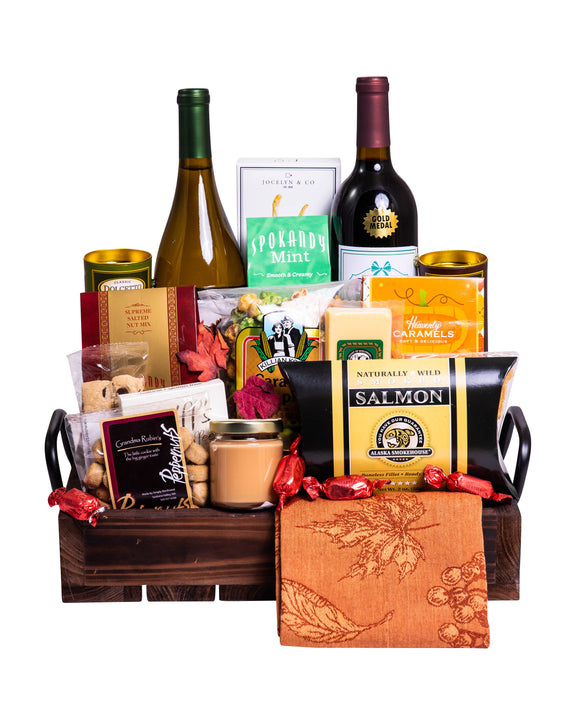 This elegant array of our favorite gourmet treats is the perfect gift to help you celebrate the Thanksgiving Holiday. This beautiful selection comes packaged in a stunning wooden tray and includes a bottle of red and white wine, smoked salmon, gourmet chocolates, our famous soft peanut brittle, savory crackers, our best selling Grandma Rubin's Peppernuts gingersnap cookies, gourmet pretzels, cherry apple crisps, a scrumptious nut mix, a fragrant seasonal candle,a gorgeous keepsake dishtowel to match the season, and much more!