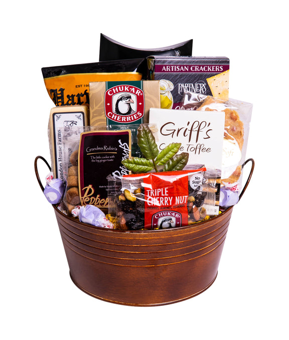 An abundant selection of our very best treats! This beautiful keepsake metal round tin comes filled with smoked salmon, cheese, crackers, our famous soft peanut brittle, gourmet popcorn, chocolate toffee, our exclusive Grandma Rubin's Peppernuts gingersnap cookies and huckleberry taffy.