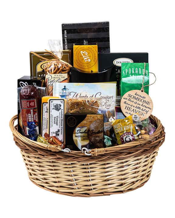 Show your sincere condolences by sending our thoughtfully designed premium gift basket filled with love and our best selling items. Included in this assortment is smoked salmon, flavorful crackers, cheese, sausage, our famous soft peanut brittle, gourmet chocolates, savory nut mixes, pretzels, and more! Also included is our popular "Words of Comfort" sympathy gift book and a wooden handcrafted sympathy ornament with sentiment "because someone we love is in heaven there is a little bit of heaven in our home" engraved on the front.
